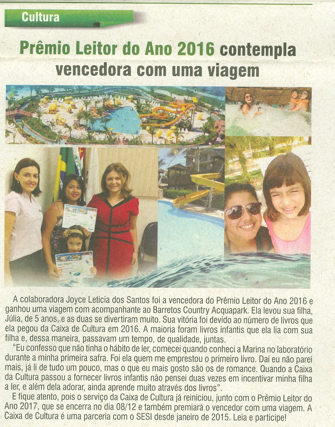 O informativo da empresa Viralcool - Empresa de Açúcar e Etanol, Edição nº 119 de março de 2017, conta como a parceria e o trabalho desenvolvido com a Caixa de Cultura incentivou uma funcionária da empresa a tomar gosto pela leitura e levar para dentro de casa esse hábito, ganhando o Prêmio de Leitor do ano em 2016 promovido pela empresa.
