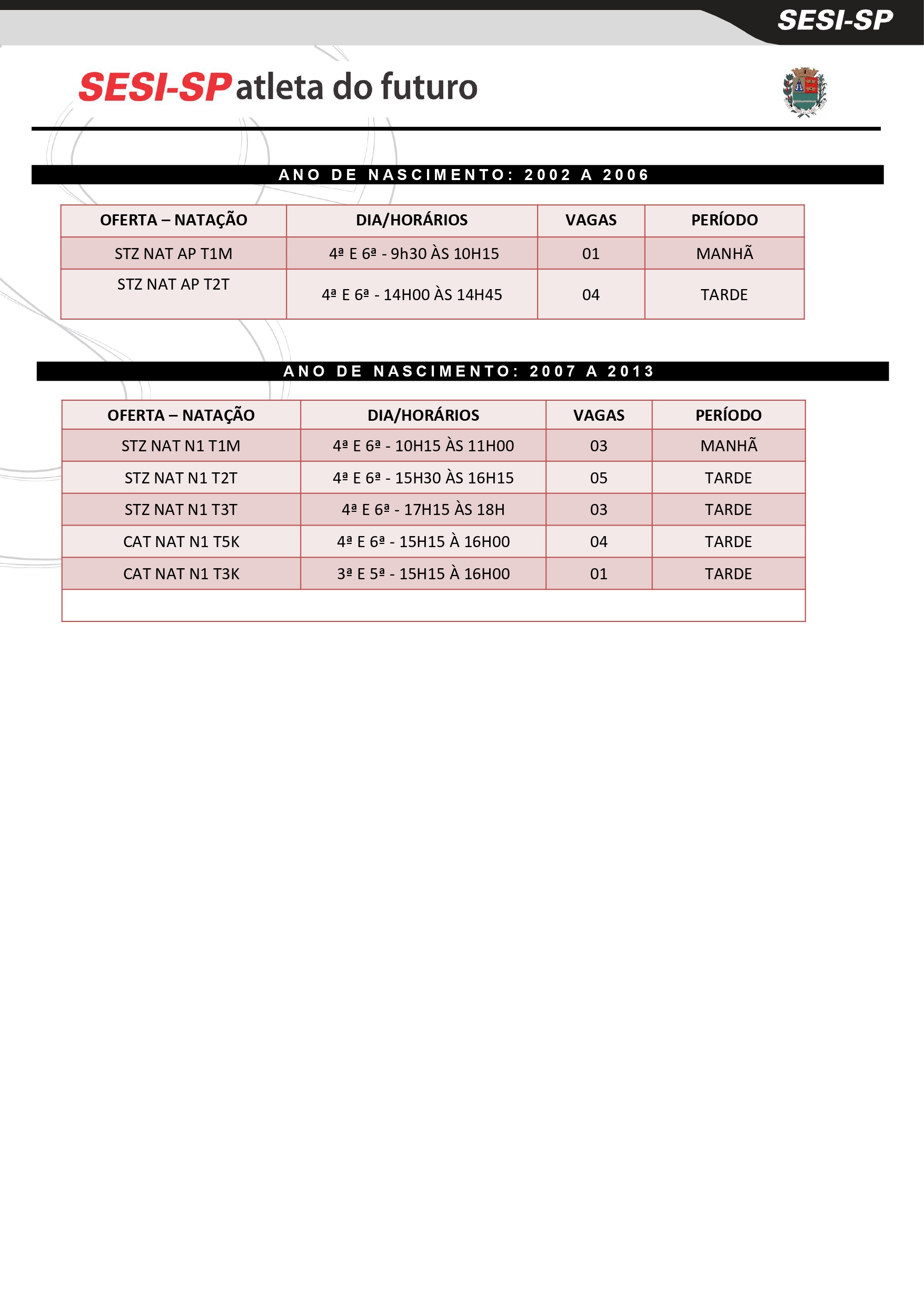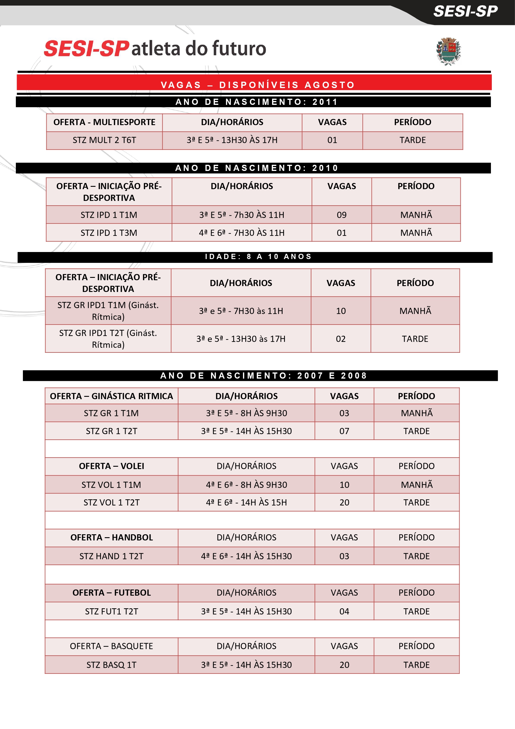 Os interessados em participar do Programa Atleta do Futuro poderão se matricular conforme disponibilidade de vagas. Os interessados devem comparecer dia 19/08 na Secretaria Única. (Retirar senha na portaria)